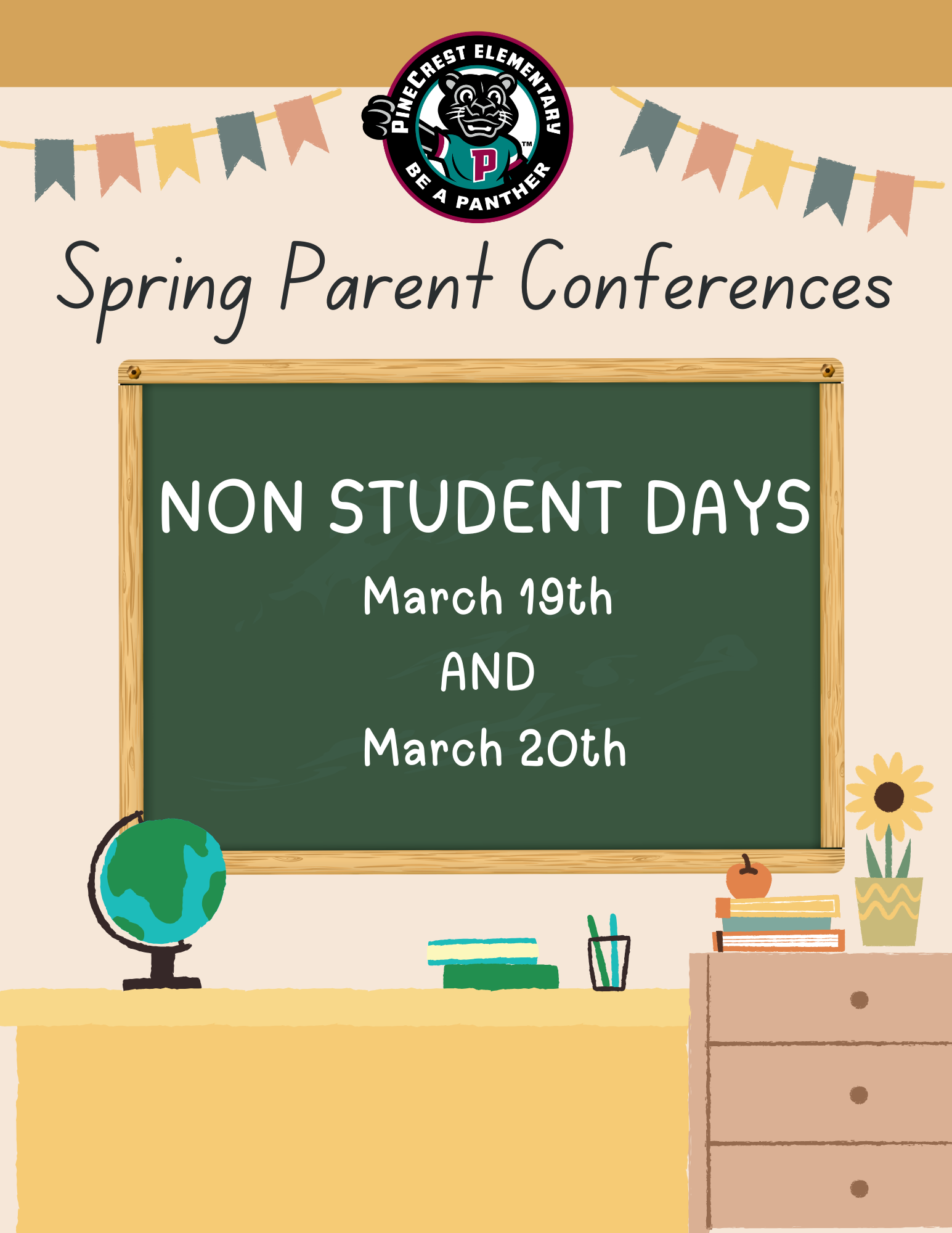 Friendly reminder, Panthers! There will be no school on March 19th and March 20th due to Spring Parent Conferences. Enjoy the long weekend!