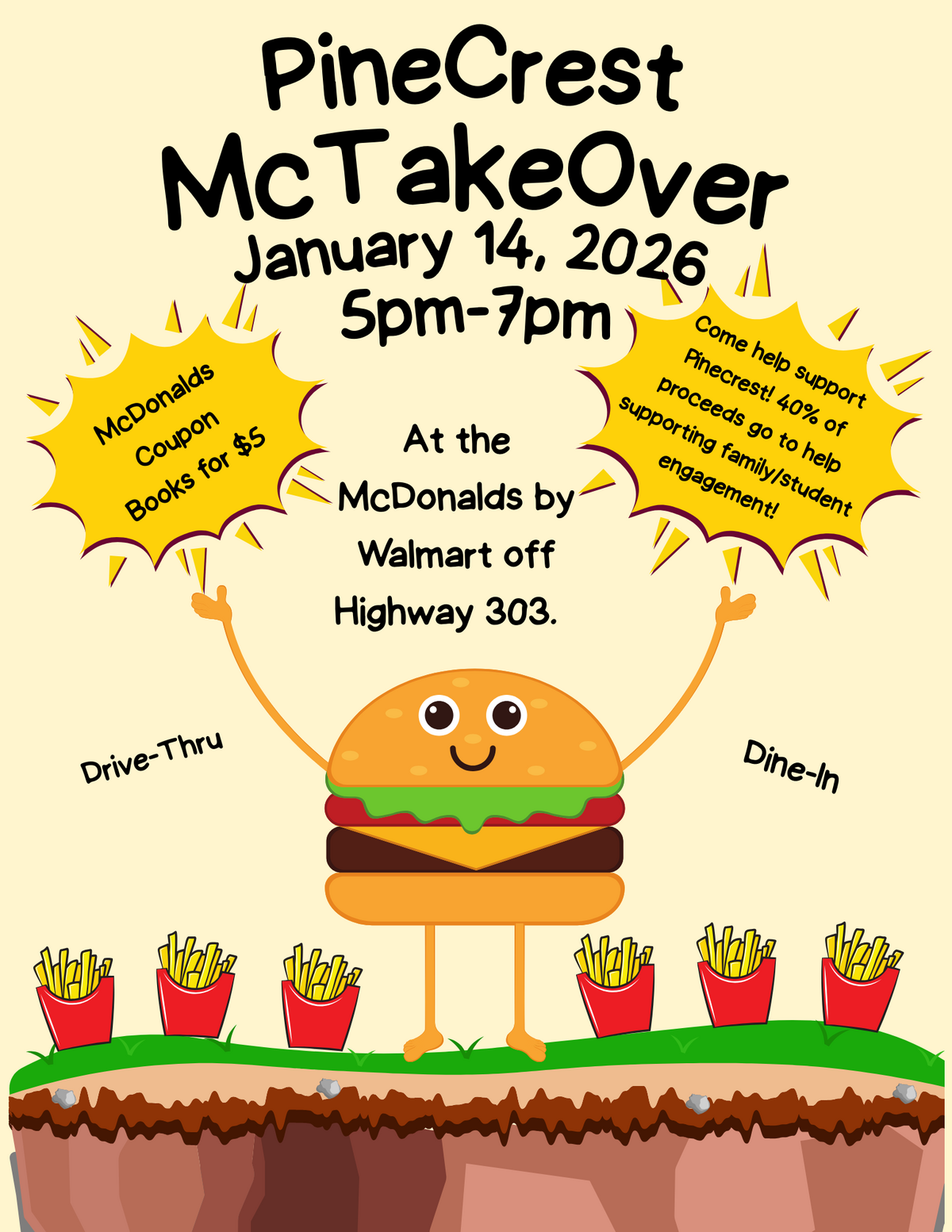 PineCrest ASB invites you to our McTakeOver on January 14th from 5-7pm! 40% of sale during those hours go towards PineCrest. Dine-in or Drive-thru. We also will have $5 McDonald's Coupon books for ...